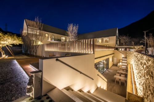 峪宿的设计则充分挖掘土地特质,使用的材料和颜色提取自山景中传统建筑形式,采用革新建筑语汇进行表现。自然融入于周边环境,形成浑然天成、得天独厚的私汤院落。峪宿拥有7个独立院落,近30间客房的民宿集群,每个房间都是一个独立的空间,靠山环景,可以观赏日出、日落、植被、山峰。整个建筑在设计过程中,充分考虑了大自然的交相辉映,以大面积暖木色为主,采用极简主义美学设计,融入当地的建筑方言。在峪宿星空掩映下的超大落地窗前,抬眼便是长城蜿蜒于山脊之中,烽火台与山景尽收眼底,夜晚繁星触手可及。